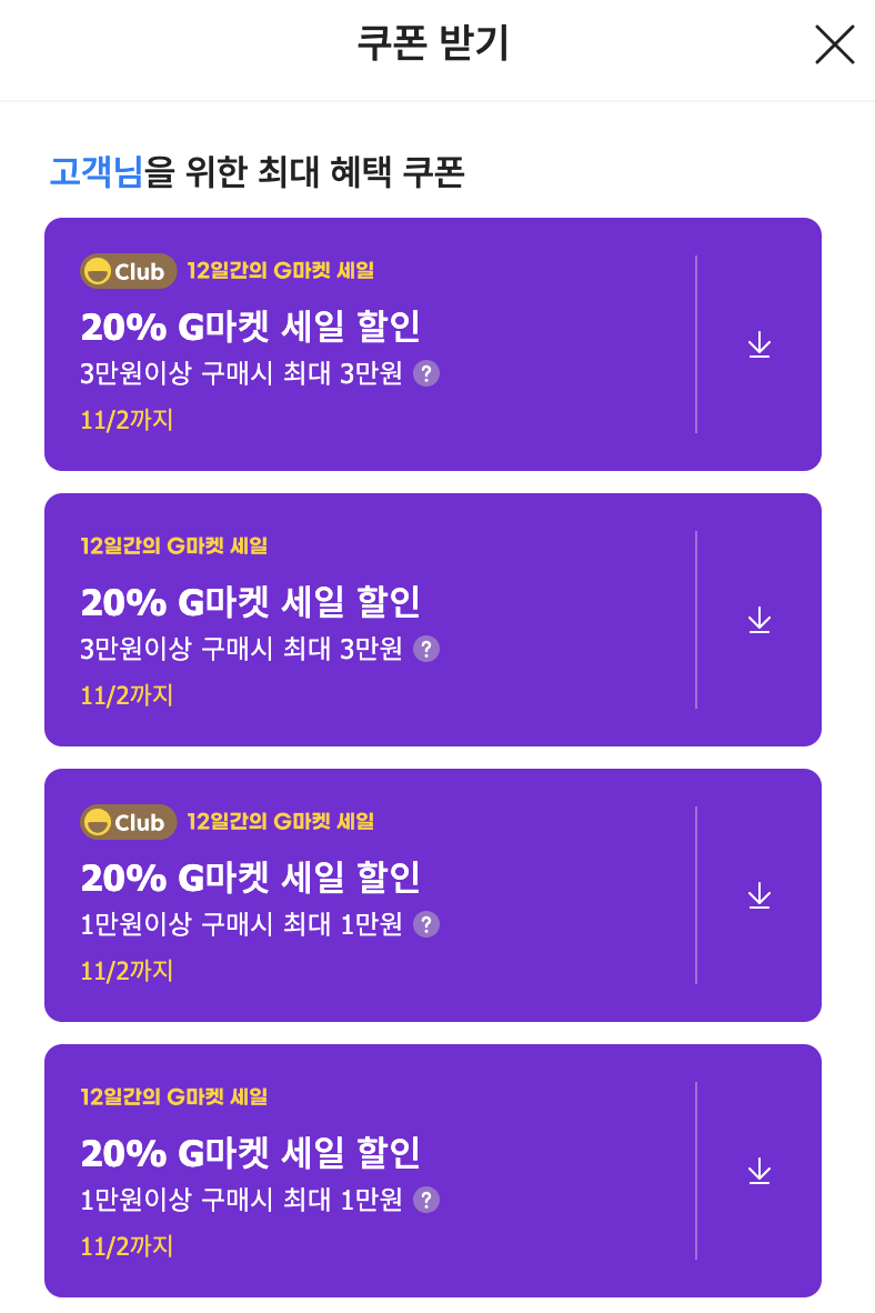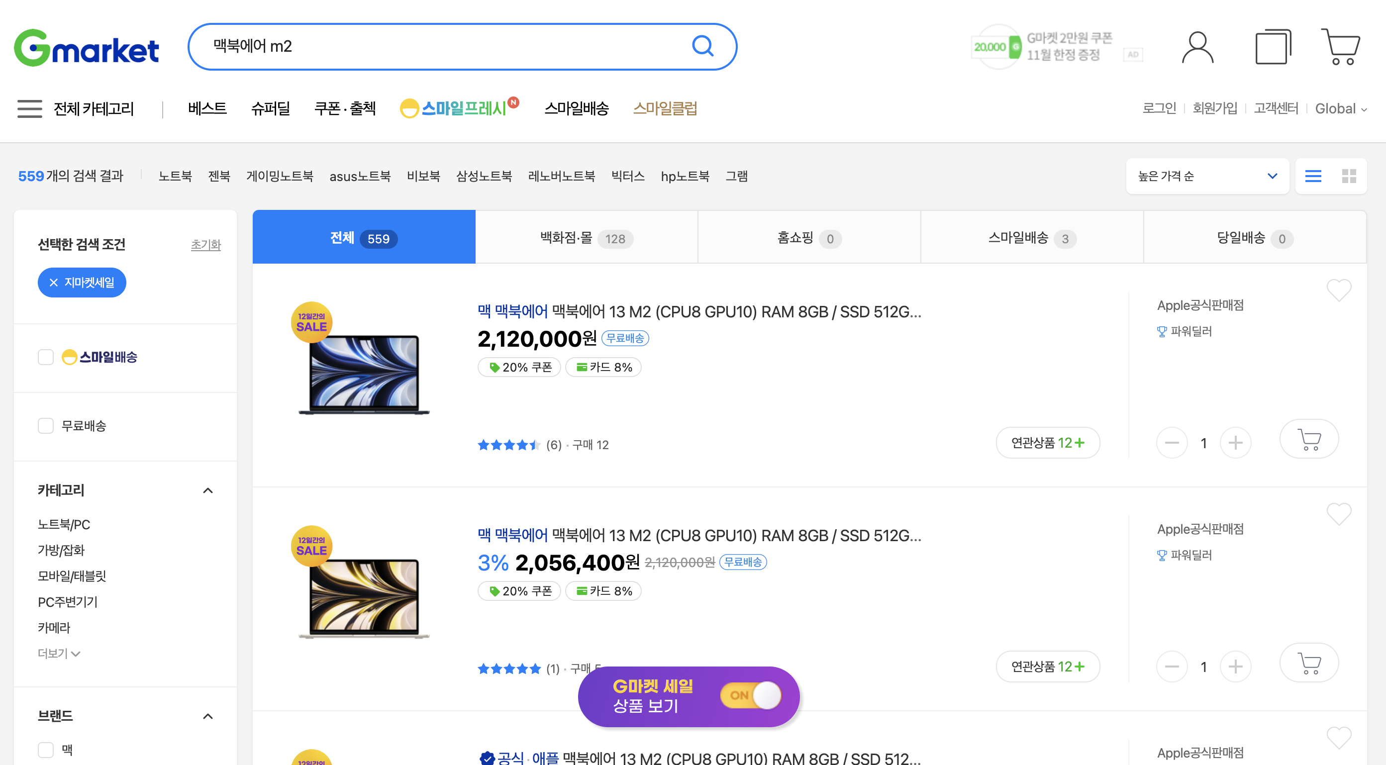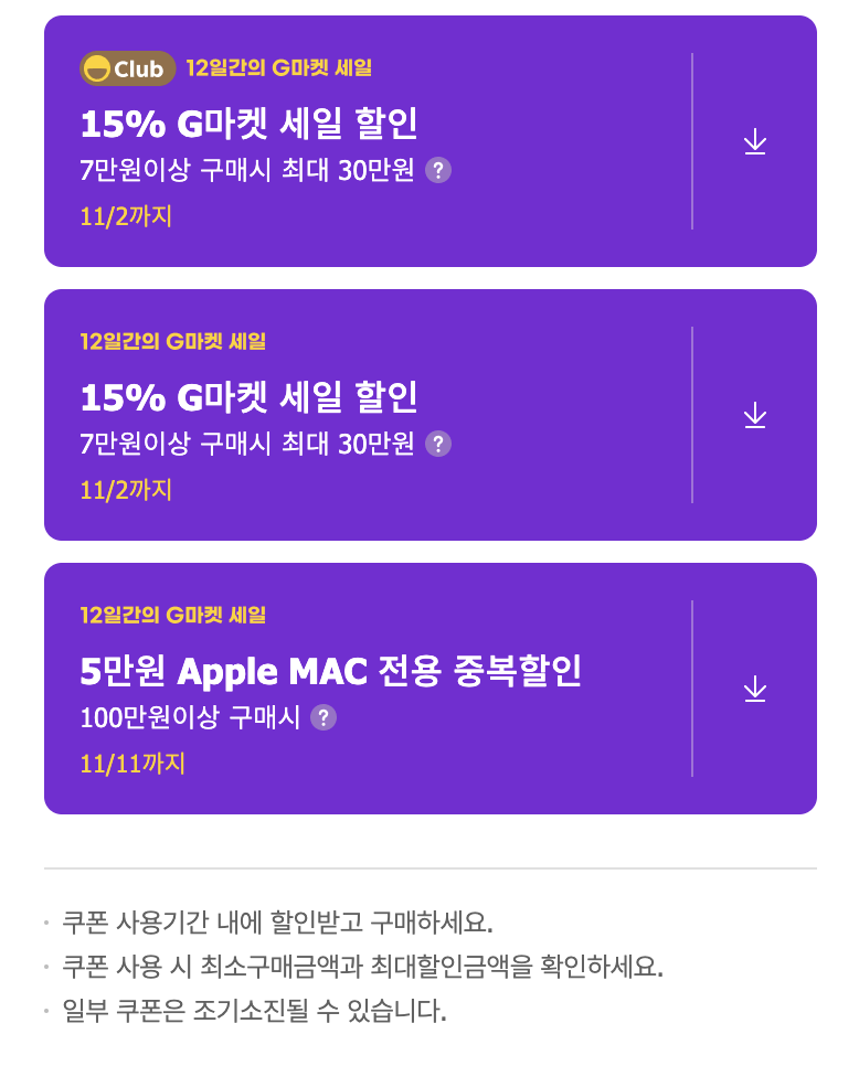 12일간의 G마켓 세일 20% 할인쿠폰이랑 15% G마켓 세일 할인 쿠폰이 있는데 최대 할인 금액을 봐야 되서, 애플 맥북의 경우 최대 30만원 할인이 되는 쿠폰을 적용하고, 거기에 애플 맥 전용 중복할인으로 100만원 이상 구매 시 5만원 할인이 되는 쿠폰까지 적용할 수 있음.