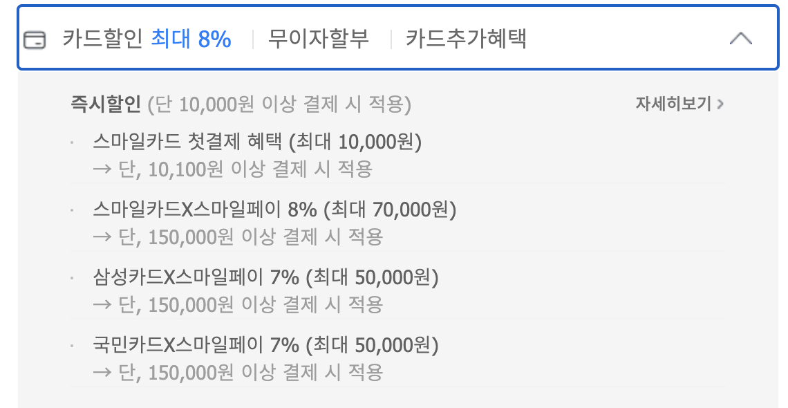 그리고 여기다가 다시 스마일카드 X 스마일페로 결제하면 최대 7만원 할인, 삼성카드나 국민카드를 스마일페이로 결제하면 최대 5만원 할인이 더 가능함.