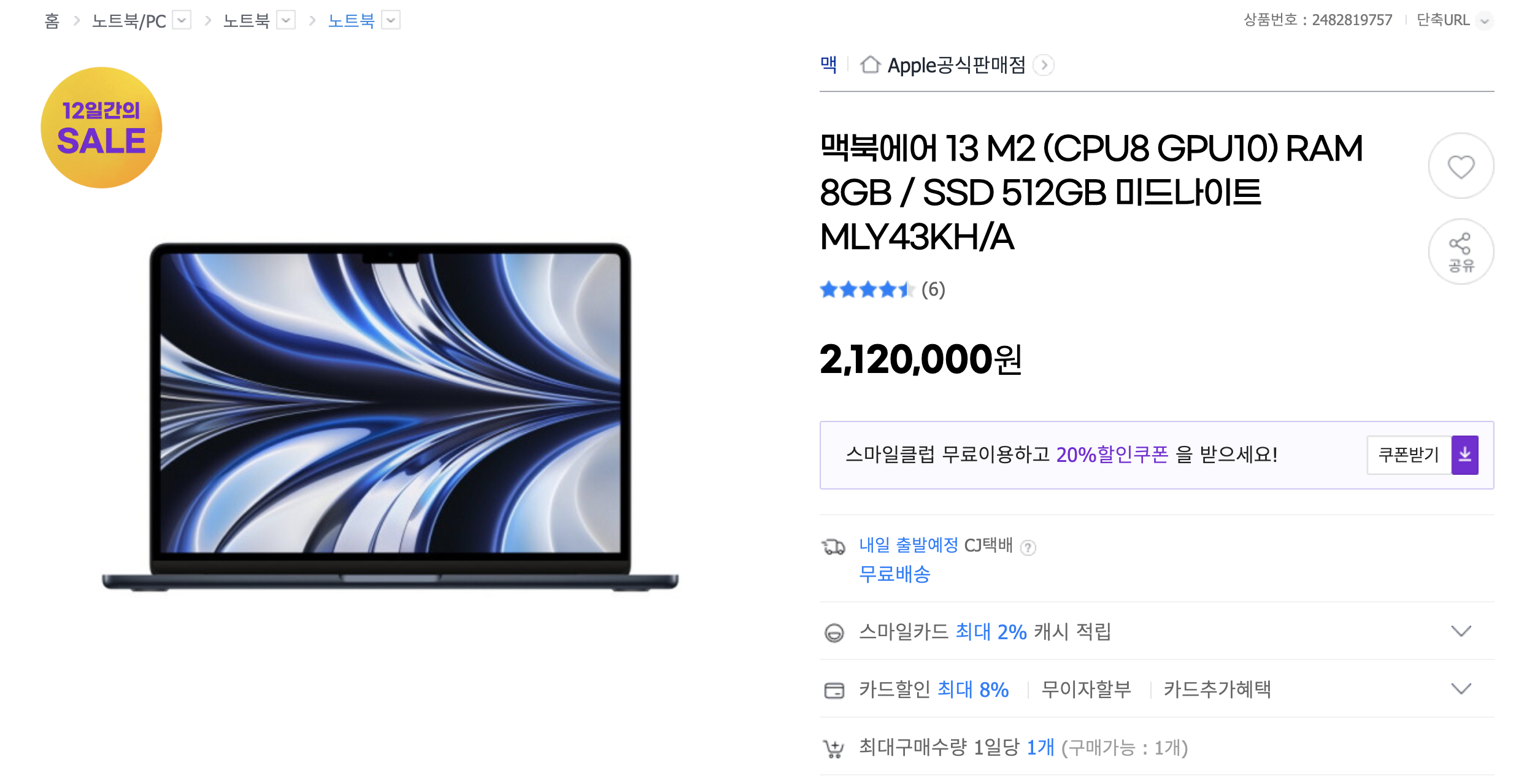 위 177만원에서 - 7만원 혹은 - 5만원이 더 가능해서 최저가 170만원 혹은 172만원에 위 스펙의 맥북에어 M2를 구매할 수 있음.
