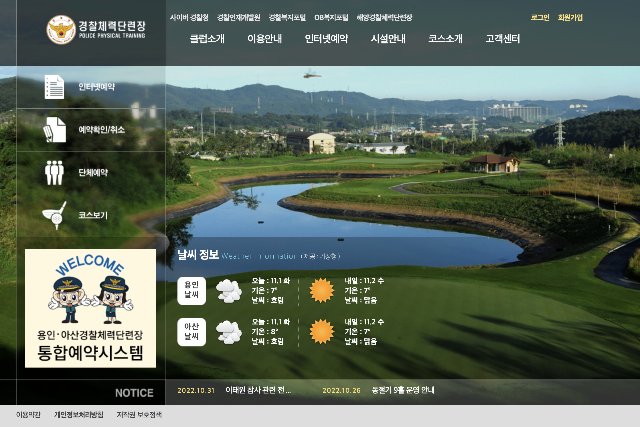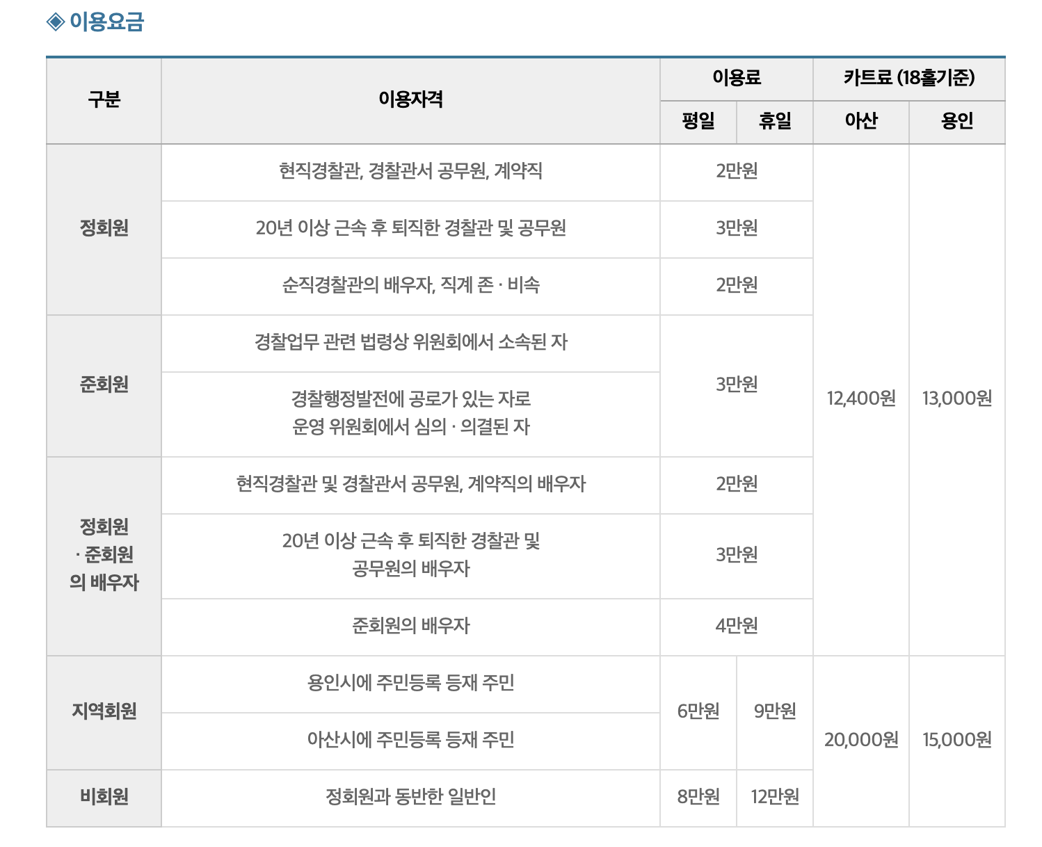 경찰체력단련장은 용인시와 아산시에 각각 9홀 코스로 설계되어 운영되고 있습니다. 용인이 8.6만평 규모, 아산이 12만평 규모의 골프장입니다. 이용하실 수 있는 회원별 가입절차와 골프장 이용요금을 안내드립니다. 참고하세요.