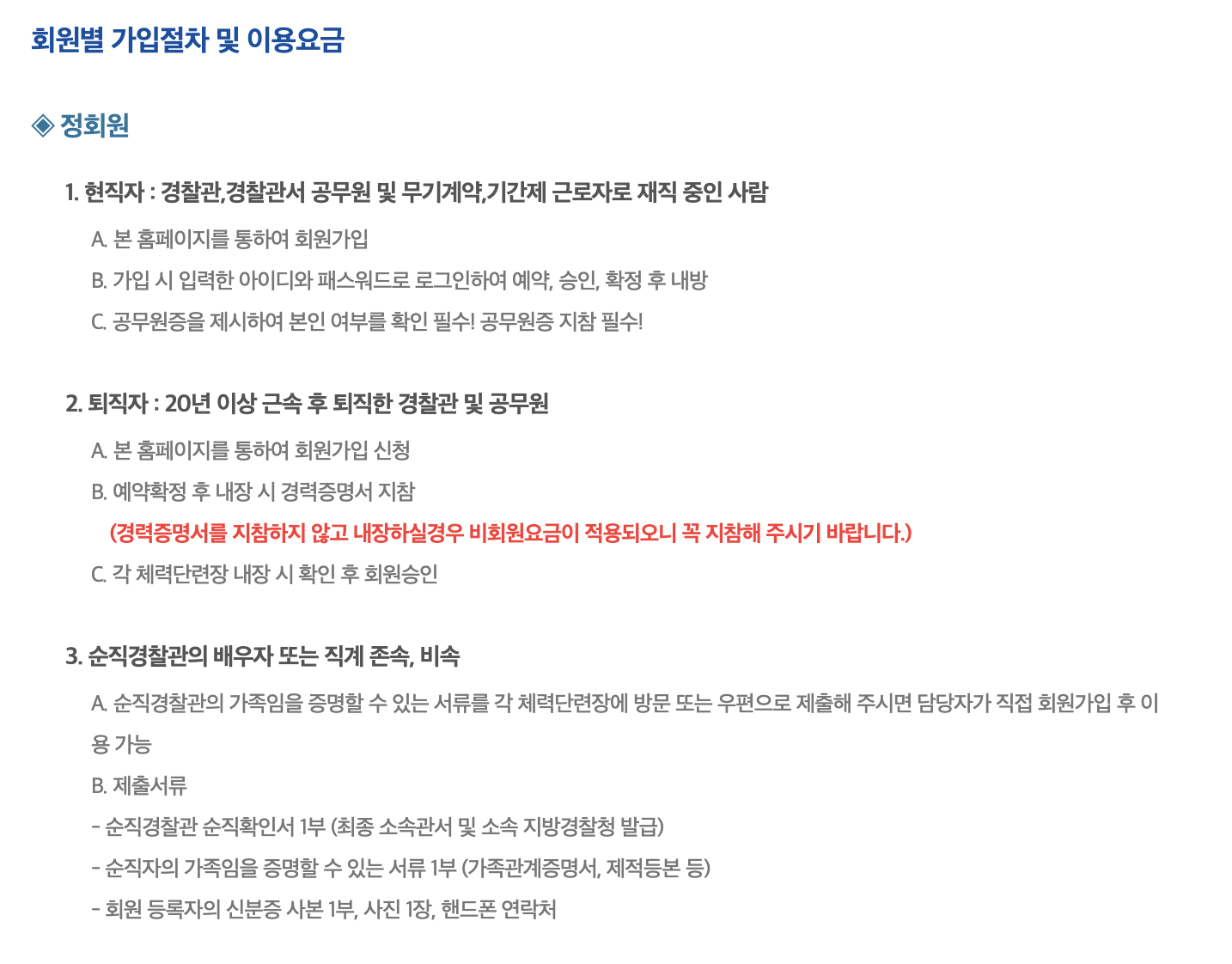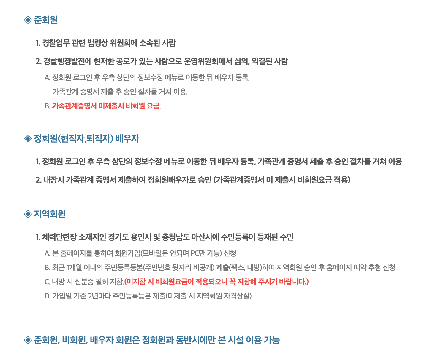 * 준회원과 비회원 배우자 회원은 정회원과 동반시에만 본 경찰체력단련장 시설을 이용할 수 있습니다.