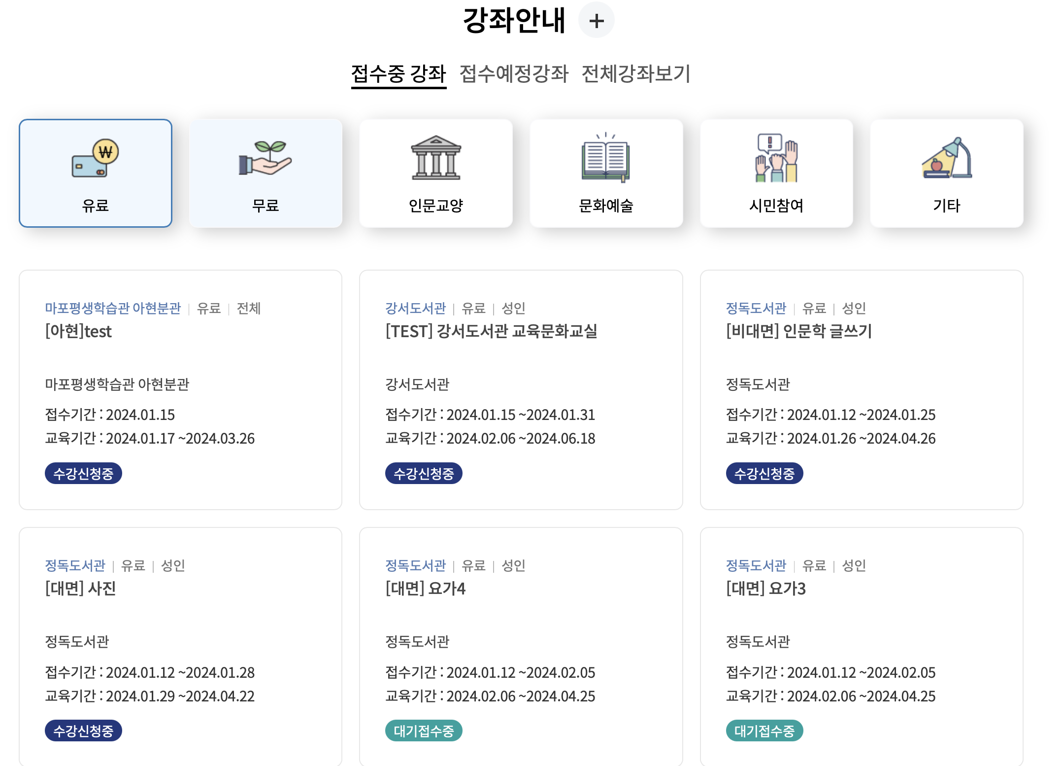 강좌안내에서 접수중인 강좌, 접수예정강좌로 구분해서 살펴보실 수 있고요, 유료와 무료 , 강의 카테고리가 인문교양인지 문화예술인지 시민참여인지 등으로 선택해서 확인하실 수 도 있습니다.