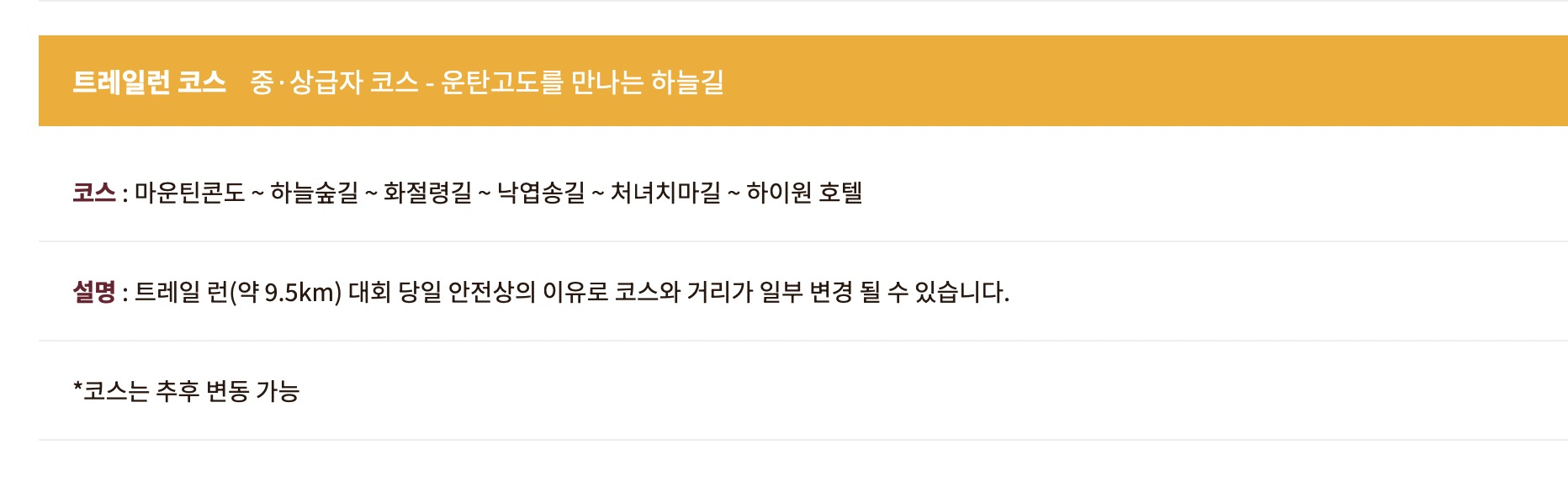- 하늘숲트레일런 (트레일 런(약 9.5km) 대회 당일 안전상의 이유로 코스와 거리가 일부 변경 될 수 있습니다.)